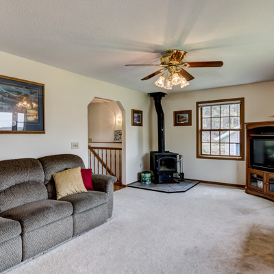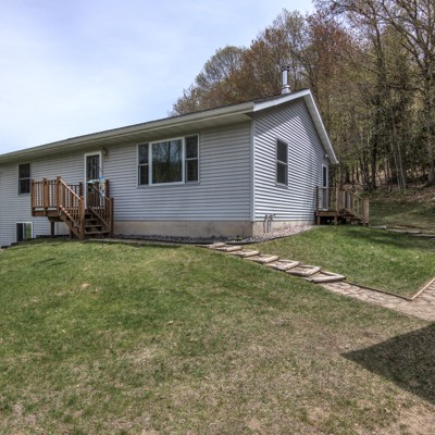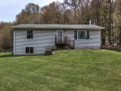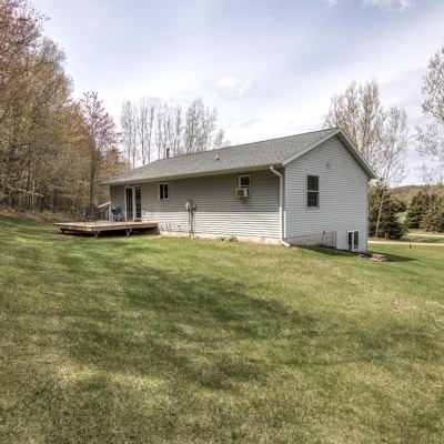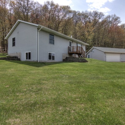 Terrific country home on 8.97 acres with room to spread out and grow! Large, detached garage, extra garden shed and huge 28x63 pole shed for vehicles, tools and toys! Spacious eat-in kitchen walks out to deck and wonderful wooded privacy. Wood stove on main level and extra insulation in attic and lower level window area for efficiency. Entire lower level is ready for you to finish--add another bedroom (windows already there) and bath (rough-in ready) and family room to expand your living space!